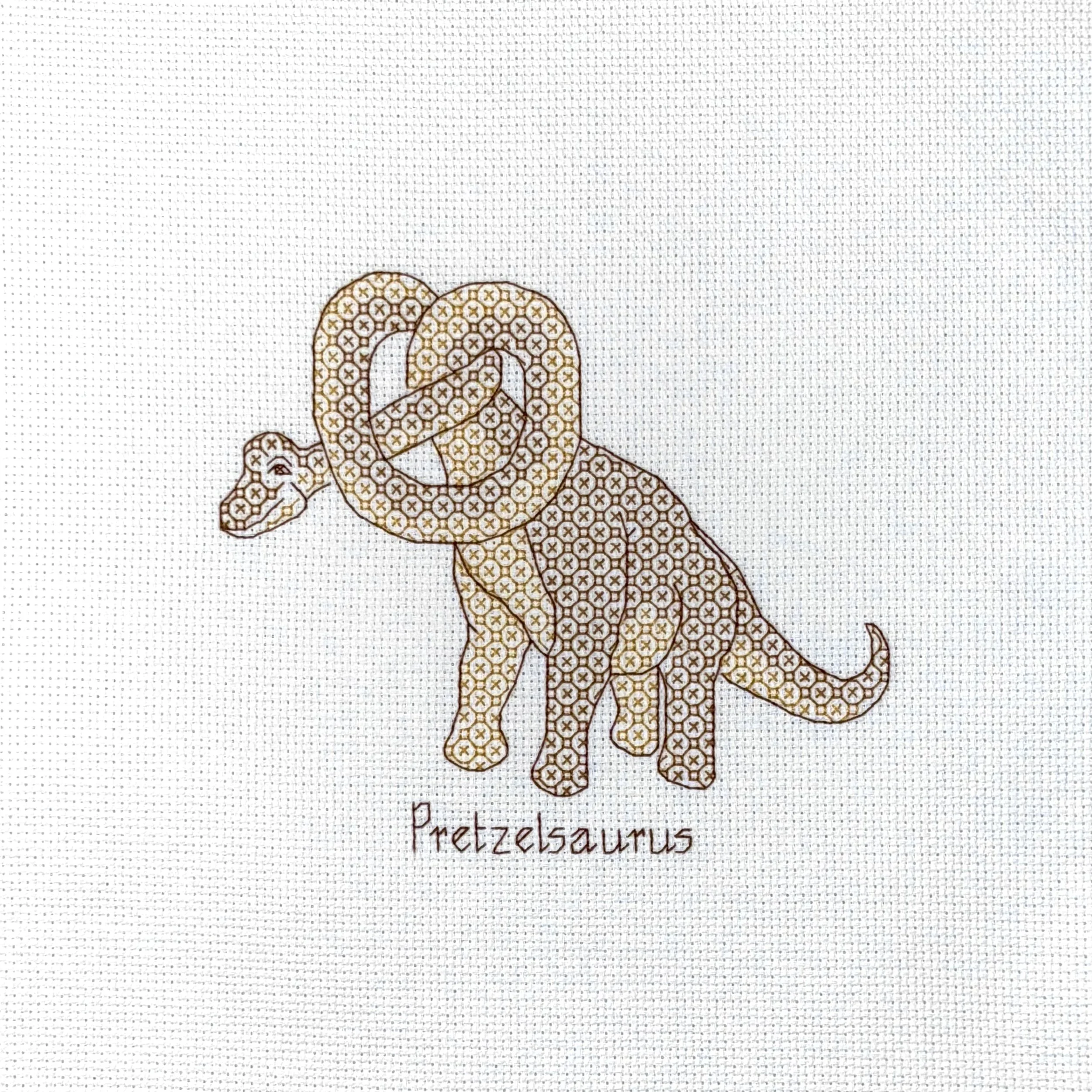 A fun stitch for fans of dinosaurs, pretzels, and etymology.